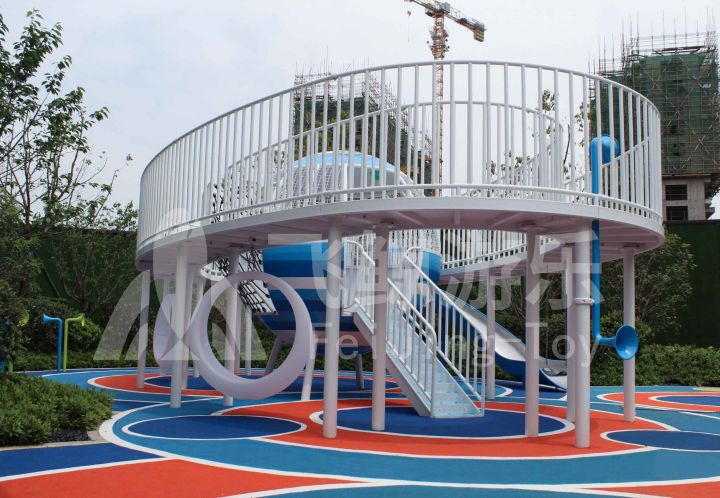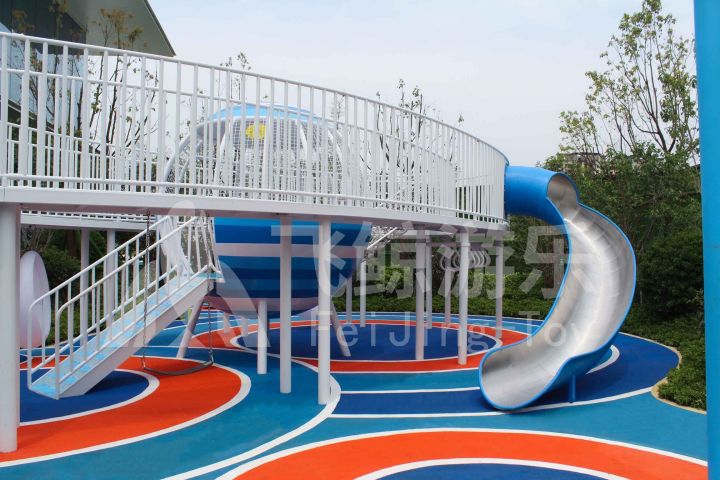 游玩设备以蓝白相间为主,沉稳、纯净,简洁风格让游玩更加沉浸,感受玩乐纯粹快乐。游玩主设备设计建造成飞船模式,儿童可在“光环”上穿梭,眺望远方,“飞船”内穿梭玩耍。游乐区还配备小型休闲游玩设备。
