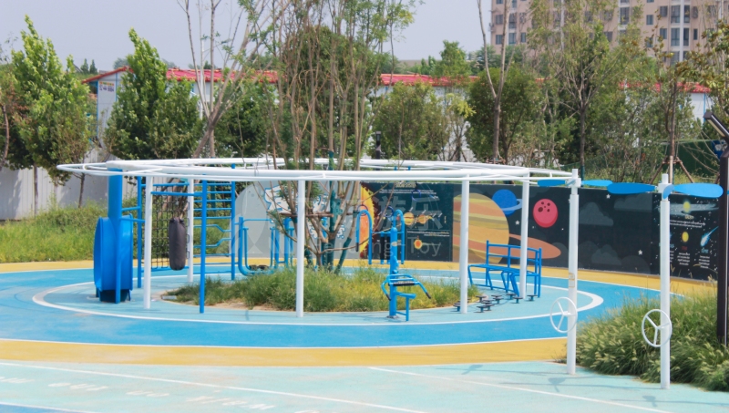 憨态可掬小熊宇航员屹立在火箭前等待着小朋友们加入,冒险号火箭已就位,环绕观察一番,火箭形象了然于心。适配于全年龄段儿童、成人的游乐空间,星际标识性创意造型吸引人们打卡互动,深受喜爱,为儿童提供一个游玩、交互空间。星河跑道引导着我们去往各个星际穿越故事节点,或者热爱自由奔跑,也可沿着星河跑道,自由穿梭遨游乐园之中。宽敞、曲线自由跑道,让儿童自在肆意奔跑,畅快玩闹。带有缓冲效果EPDM地垫,减少运动震动,缓冲保护儿童,为儿童快乐玩耍保驾护航。星环