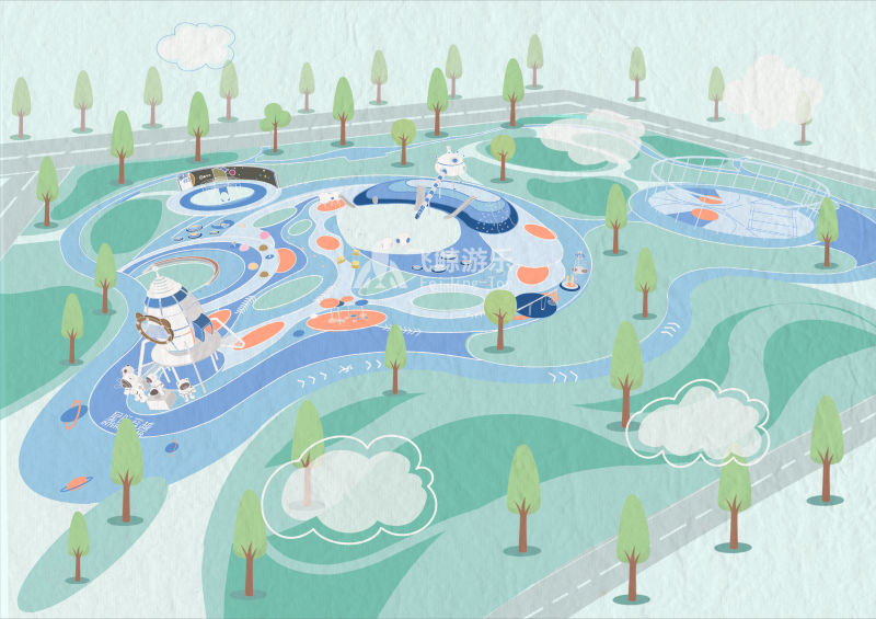 本次设计以“星际穿越”为主题,场地宽阔,玩法丰富,地标式的小熊火箭、飞船登陆与星系共同构筑了一幅科幻、冒险的星际画卷,吸引小朋友大朋友前来探索。乐园集结“观光、游憩、运动以游乐及绿意生态”等多种功能,多元化的活动空间,让亲子陪伴体验多种快乐,也为市民提供更好的户外空间。