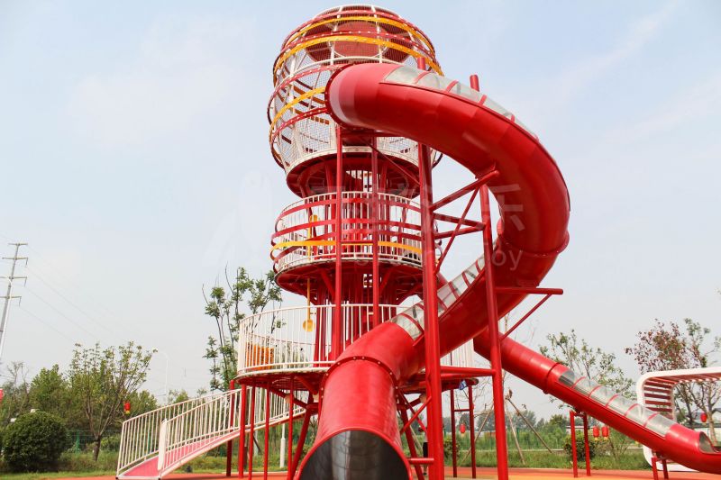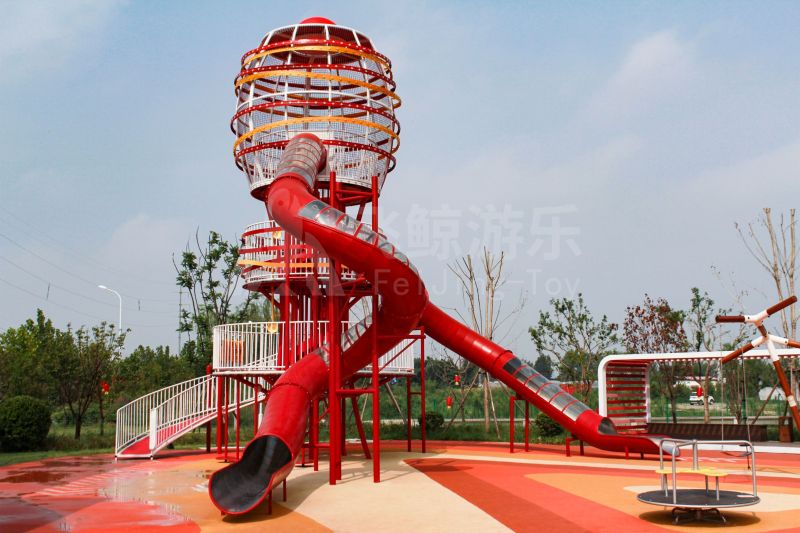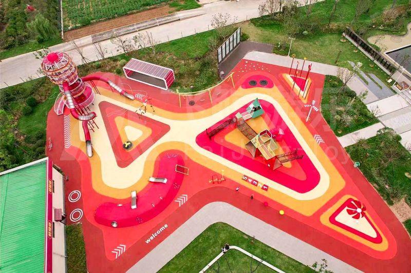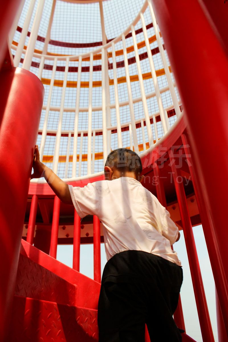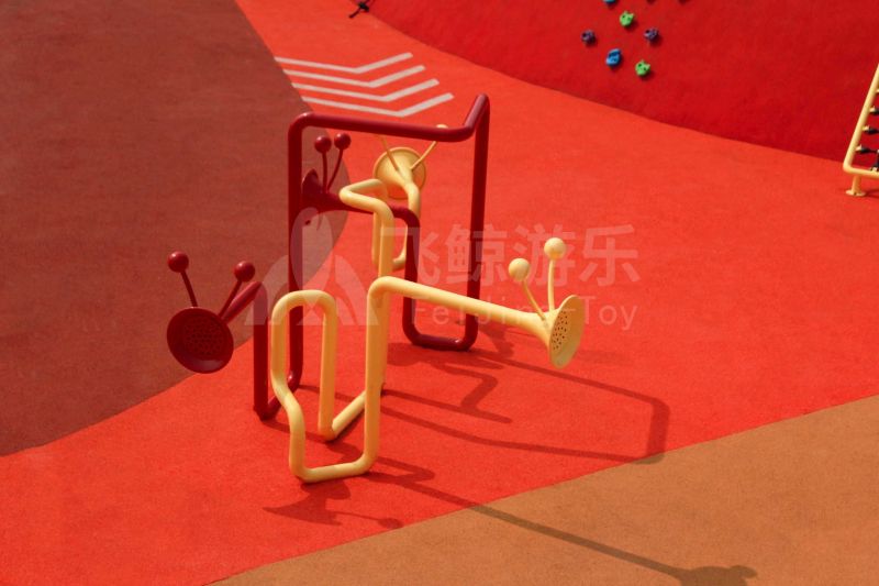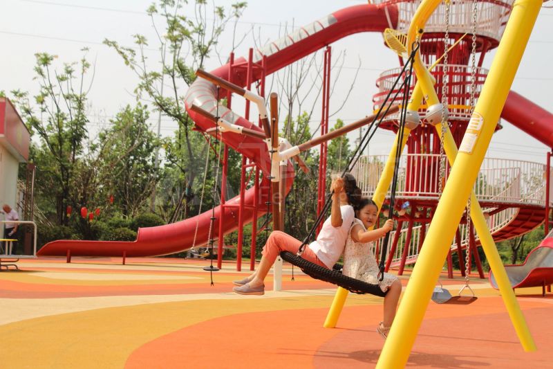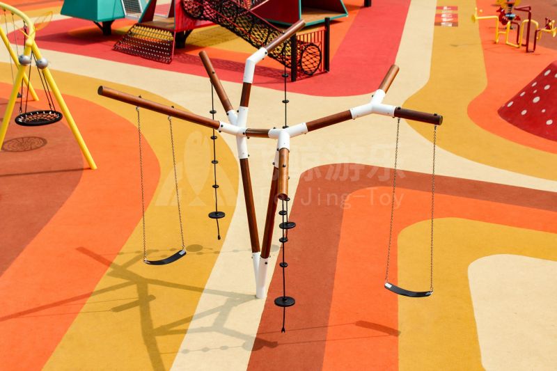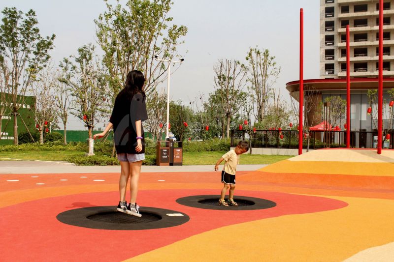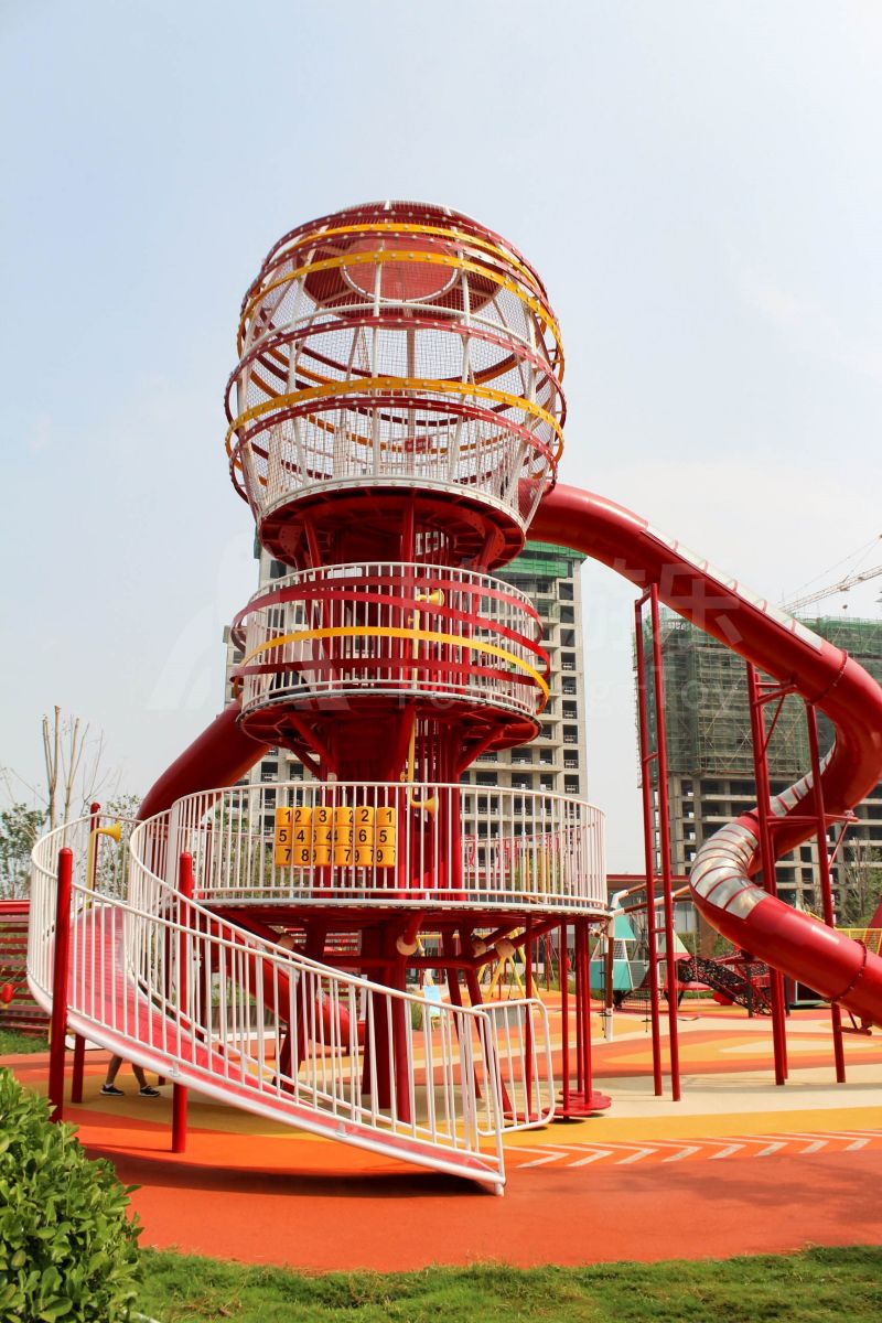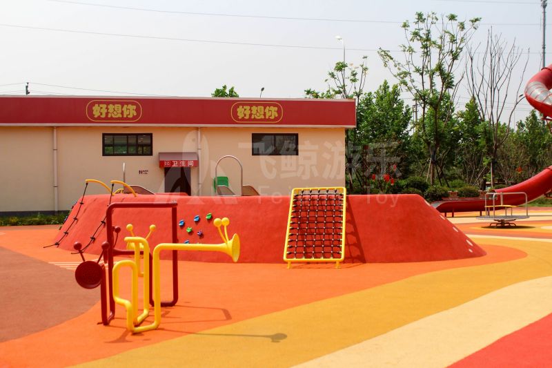 场地整体设计以集团产品“红枣”--红枣色系规划设计,彩色地绘红橙相间激发活力之情。灯塔滑梯由红枣造型设计提炼而成,白天他是火热的高塔滑梯,夜里他是闪烁美丽的灯塔。双滑梯体验不同高度滑落快乐,搭配益智小设备,打击乐器、数字滚筒,玩法更多样。 勾勒地形,攀登或者滑下起伏之间多一种趣味,爬网、攀登点、爬绳,总有一种让你体会到攀爬的快乐。精灵树屋乐趣多,攀爬至不同树屋,是属于自己秘密基地。驻足一番,看看风车,感受下夏天的风。绳网、木板、 多种材质攀爬和触摸,都在和自然对话。亲近自然的空间往往能够提供无形的吸引力,更多丰富的材料和空间,感知自然、与自然互动,能够让孩子们沉浸其中。 秋千荡漾着,荡起内心的欢愉、安逸。大大的鸟巢秋千,可以坐着躺着,和小伙伴背靠背也是不错选择。月亮秋千给人梦幻感觉,让荡秋千多了一种梦幻感觉。骑上摇摇车,摇呀摇,摇到记忆里最快乐的时光。远处有朵散落的云,站在云朵上,蹦蹦跳跳。 飞鲸游乐本次儿童空间设计遵循趣味性的原则,曲线宽阔的奔跑环境、丰富活泼的色彩激起儿童自在玩耍。趣味设备点缀在场地各处,让儿童主动探索发现乐趣,尽情挥洒他们的天真与烂漫。