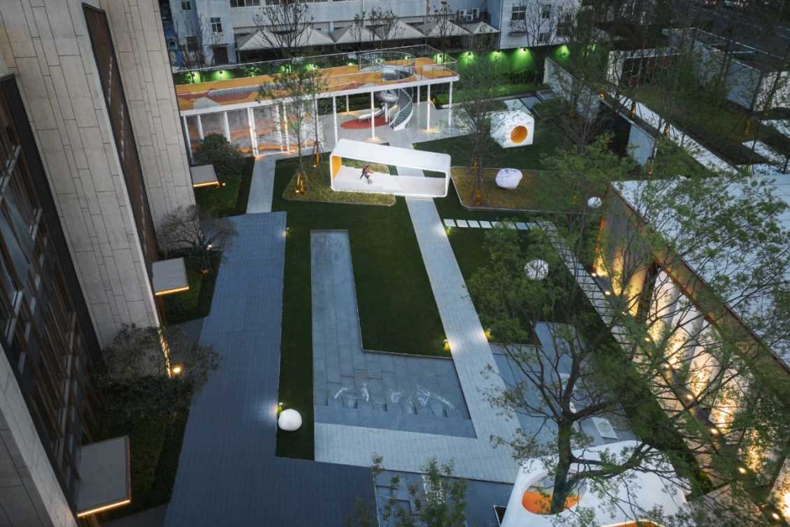 穿过绿意鲜氧的草坪空间,是一处欢快的绿洲儿童乐园。大小不一的森林盒子、功能的多样、几何的拼贴、趣味的廊架、层叠的绿意。奔跑、攀爬、躲藏、学习,处处皆有惊喜,处处皆是乐趣。构筑本身不会限定他们的行为,而是在时时刻刻释放他们的天性,激发孩子们的好奇心和无尽的想象力。